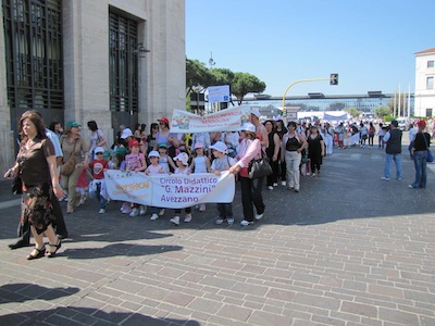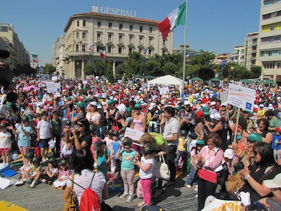 La manifestazione ha preso il via alle 9.30 in punto con il raduno in piazza della Repubblica e il lungo corteo che, attraversato l’incrocio con corso Vittorio Emanuele, bloccando momentaneamente il traffico veicolare, ha sfilato lungo l’intero corso Umberto: a guidare la sfilata è stato un gruppo musicale jazz seguiti dal sindaco di Pescara, Luigi Albore Mascia, città che per la prima volta ha ospitato la giornata finale della manifestazione, da tutti i Comuni aderenti con i gonfaloni cittadini, e dagli studenti, ciascuno con il gonfalone della scuola di provenienza. E il corteo si è concluso in piazza Salotto dove i bambini hanno preso parte alla festa e dove tra l’altro è stato installato un maxi-schermo per un collegamento via web con la Comunità Europea.