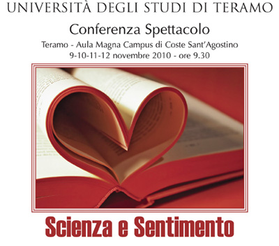 TERAMO – Da martedì 9 a venerdì 12 novembre oltre 1.500 studenti delle Scuole Superiori della provincia di Teramo parteciperanno alle conferenze-spettacolo dal titolo Scienza e Sentimento che andranno in scena nell’Aula Magna dell’Università degli Studi di Teramo alle ore 9.30.