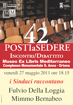 ORTONA (CH) – Domani,venerdì 27 maggio ,alle ore 18.15, all’interno della sala conferenze del Museo Ex Libris Mediterraneo presso il Complesso Monumentale di Sant’Anna, a Ortona, si terrà un incontro-dibattito nell’ambito del ciclo “42 posti a sedere”: Ortona, i Sindaci raccontano.