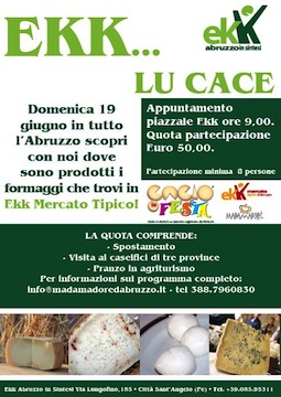 La giornata “Ekk lu cace!” è solo uno dei primi esempi del progetto “Ekk vacanze tipiche d’Abruzzo” ed è frutto della collaborazione tra “Ekk – Abruzzo in sintesi”, la cooperativa pescarese “Madamadorè” e la manifestazione “Cacio in festa”.