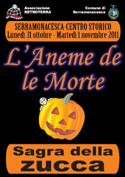 A Serramonacesca si narra che nelle nebbiose sere di ognissanti e di tutti i morti, le anime dei defunti vaghino per le vie del paese, fermandosi nelle case a chiedere che venga dato loro qualcosa. Tale credenza, comune a molte zone d’Abruzzo è sopravvissuta a Serramonacesca, dove l’anima dei trapassati è rappresentata da zucche lavorate a mo’ di testa. I bambini passano di casa in casa, recando con loro le zucche illuminate da una candela, e bussano alle porte. Come tradizione vuole, alla risposta del padrone “Chi è?” essi rispondono in coro:” L’ANEME DE LE MORTE”. Quindi i bravi Serresi elargiscono loro monetine, frutta secca, caramelle, ecc.