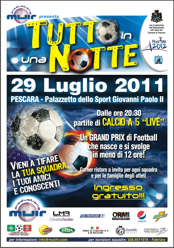 PESCARA – “Si chiama ‘Tutto in una notte’, una notte bianca dello sport, sei ore no-stop di Calcio A 5 che prenderanno il via alle 20 di quest’oggi, venerdì 29 luglio, per concludersi solo alle 2 di sabato 30 luglio, un evento che rappresenterà un assaggio della vera ‘Notte Bianca’ dello sport che l’amministrazione comunale di Pescara realizzerà per il prossimo anno, in occasione del conferimento ufficiale del titolo di ‘Città Europea dello sport per il 2012”.