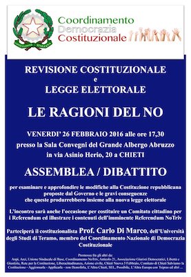 – venerdì 26 febbraio 2016, ore 17,30, Sala convegni Grande Albergo Abruzzo, Chieti, Assemblea/dibattito sul tema: “Revisione costituzionale e legge elettorale. Le ragioni del NO”;