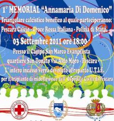 PESCARA – Sabato,3 settembre,alle ore 18.00, presso il Campo San Marco in Via Aldo Moro a Pescara si terrà il 1° Memorial “Annamaria DI DOMENICO”. Si tratta di un Triangolare calcistico benefico al quale parteciperanno: