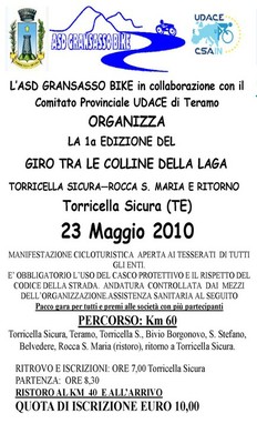 TORRICELLA SICURA (TE) – Domenica, 23 maggio 2010, l’ Asd Gransasso Bike in collaborazione con il Comitato Provinciale UDACE di Teramo organizza la 1a Edizione del Giro tra le colline della laga Torricella Sicura—Rocca S. Maria e ritorno.