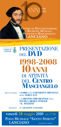 LANCIANO (CH) – Questo pomeriggio, alle ore 17.30, presso il Polo Museale “Santo Spirito” sara presentato il DVD che riepiloga dieci anni di attività del Centro di Documentazione e Ricerche Musicali “F. Masciangelo” di Lanciano.