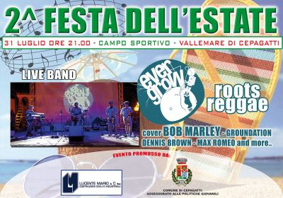 CEPAGATTI (PE) – Venerdì prossimo, 31 luglio dalle ore 20 in poi, presso il Campo sportivo di Vallemare di Cepagatti si svolgerà l’evento “2° Festa dell’Estate”. Nell’occasione si esibirà la live band Ever Grow in un repertorio di musica reggae e cover di Bob Marley.