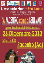 PACENTRO (AQ) – L’ Associazione Proloco di Pacentro comunica che Giovedi 26 dicembre 2013 dalle ore 16.00 nel centro storico di Pacentro si terrà la XVI° edizione del Presepe vivente. “A Pacentro come a Betlemme” è divenuta tra le più importanti tradizioni folkloristiche a Pacentro, un momento di grande attazione per il circondario peligno nonchè di forte richiamo turistico. Ha luogo ogni anno durante le festività natalizie. Una rappresentazione a cavallo tra il sacro ed il profano: ricreare la mistica atmosfera del natale a Betlemme, caricandola di una valenza popolare strettamente legata alla tradizione contadina del luogo. L’evento culturale diviene strategia esplicita di rigenerazione dei quartieri del borgo, attualmente spopolati e che anticamente costituivano il cuore pulsante del paese. Il percorso viario del “Colle” fungerà da catalizzatore di una serie di performance collaterali nello sforzo di ricreare un ritmo di vita perduto, scandito dagli incontri nelle botteghe di raccolta che non sono puro decoro, ma esperienza partecipata e in grado di rigenerare il quartiere urbano trasformandolo in un organismo capace di ricreare modi di vita, di attraversamento e utilizzo fuori dalla routine del quotidiano. Una poderosa occasione per instaurare un rapporto biunivoco tra le persone ed il borgo: esso, attraverso le singole location, offre stimoli visivi-tattili-olfativi, una serie di sensazioni e seduzioni che i fruitori utilizzano per ricreare il concetto di paese e storia e per identificarvisi. Le locande culinarie di dolci, pizze, gnocchi, urritj, castagne, inondano i vicoli di profumi antichi e che accompagnano i visitatori durante la passeggiata verso la grotta.