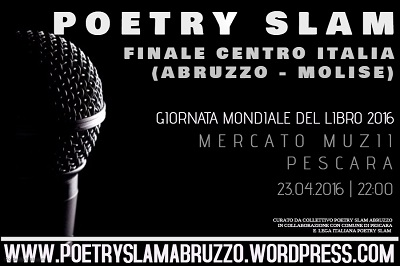 PESCARA – L’attesa Finale Centro Italia (Abruzzo – Molise) 2016 di Poetry Slam si terrà a Pescara (Mercato Coperto Muzii), sabato 23 aprile 2016 alle ore 22.00. L’evento consiste in una competizione tra poeti che si sfidano con propri versi letti a alta voce davanti a una giuria estratta a sorte dal pubblico.