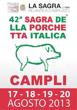 La Pro Loco di Campli punta quest’anno sulla cultura, sulla forte differenziazione dell’offerta musicale ed ha innovato anche la comunicazione, tramite giocose strategie di “guerrilla marketing”, da visionare on line sul profilo Facebook della Pro Loco (https://www.facebook.com/prolococittadicampli). La 42° edizione della Sagra della Porchetta Italica è organizzata dalla Pro Loco di Campli, in collaborazione con il Comune. Sponsor dell’evento “Globo Calzature”. Maggiore anche l’attenzione verso il visitatore, infatti all’arrivo delle auto nei diversi parcheggi gratuiti messi a disposizione sara’ distribuita una brochure con la piantina della manifestazione, con la quale si potrà scegliere dove acquistare la porchetta, dove sedersi, che musica ascoltare, i monumenti di Campli da visitare e se effettuare una visita guidata denominata “Un panino dicultura” con l’Associazione Gemini (http://geminicampli.wordpress.com).