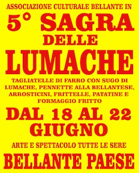 BELLANTE (TE) – Dal 18 al 22 giugno a Bellante Paese si terrà la 5° edizione della Sagra delle Lumache. Nel belvedere dove sarà possibile ammirare il suggestivo panorama dalla Val Vibrata fino al mare, ci sarà la possibilità di assaggiare alcuni piatti tipici della tradizione. Organizzato dall’associazione ‘’Bellante In’’ con la collaborazione di numerosi ragazzi e dalle signore del Paese che metteranno a disposizione le loro doti culinarie e garantito l’ottima qualità dei cibi serviti, si potranno assaporare antiche ricette come il sugo di lumache accompagnato alle Tagliatelle di Farro e le Pennette alla Bellantese, piatto tipico della zona con piselli, funghi e carne macinata.