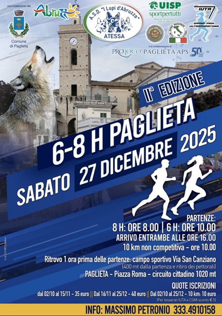PAGLIETA – Come già avvenuto nel 2024, Paglieta si prepara ad accogliere i podisti più determinati, quelli che misurano la sfida in ore e non in chilometri. Si rinnova infatti, per la seconda volta, l’appuntamento con la 6/8 Ore Città di Paglieta, ultimo atto podistico dell’anno 2025 targato UISP.