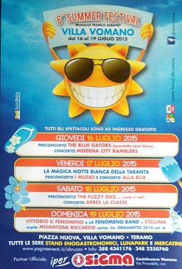 VILLA VOMANO (TE) – Si svolgerà dal 16 al 19 luglio in Piazza Nuova a Villa Vomano il 6° Summer Festival “Memorial Franco Albano”. Nei giorni del festival sono previsti due grandi concerti: Modena City Ramblers il 16 (pre-concerto dei The Blue Gators) e Après La Classe il 18 (pre-concerto dei The Fuzzy Dice). Nel mezzo il 17 si terrà la Magica Notte della Taranta con il gruppo salentino Alla Bua (pre-concerto de I Musici). La grande chiusura sarà con i big abruzzesi il 19: Vittorio il Fenomeno con la strepitosa partecipazione di Stellina, ospite Misantone Riccardo (campione italiano organetto 2014 cat. A). Tutti gli spettacoli saranno ad ingresso gratuito. Tutte le sere sono previsti stand enogastronomici, lunapark e mercatini.