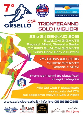 La Settima edizione dell’Orsello Cup è stata pensata con l’obiettivo di promuovere fortemente questo sport soprattutto a livello di base, stimolando la partecipazione di tutti i Club del Centro Italia anche con gli atleti più piccini, difatti le categorie Super Baby, Baby e Cuccioli avranno l’opportunità di disputare due gare per ciascun giorno. La manifestazione organizzata come di consueto dallo Sci Club Orsello in collaborazione con la Scuola Sci Le Aquile, la BMS Srl e la Campo Felice SpA, sarà aperta a tutti i tesserati FISI di tutte le categorie (dai Super Baby sino ai Seniores) e richiamerà tantissimi atleti non solo dal Lazio, ma da tutte le Regioni limitrofe come Abruzzo, Marche, Umbria, Molise e Campania, essendo ormai diventato per tutti un vero e proprio “appuntamento da non perdere”.