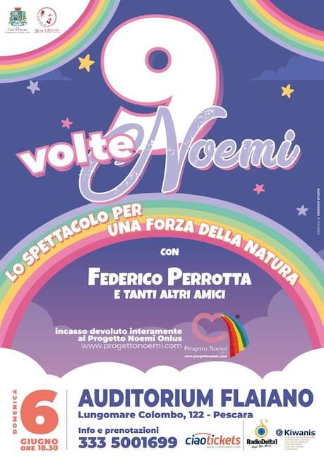 PESCARA – La piccola e forte Noemi Sciarretta, la bimba affetta da SMA1 di Guardiagrele, compie 9 anni e Pescara si prepara a festeggiarla con un evento previsto per domenica 6 giugno 2021 alle ore 18.30, presso l’Auditorium Flaiano dove sarà omaggiata, nel pieno rispetto delle prossime norme anti – Covid19, con una festa a lei dedicata: “9 volte Noemi”, lo spettacolo per una forza della natura sarà presentato dall’attore abruzzese Federico Perrotta insieme a tanti altri amici.