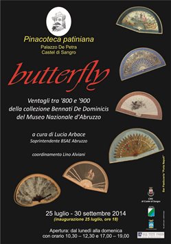 CASTEL DI SANGRO (AQ) – A Castel di Sangro,presso la Pinacoteca patiniana venerdì,25 luglio 2014,alle ore 18.00,sarà inaugurata la mostra BUTTERFLY ,ventagli tra ‘800 e ‘900 della collezione Bennati De Dominicis del Museo Nazionale d’Abruzzo, curata da Lucia Arbace (Soprintendente BSAE per l’Abruzzo).L’esposizione rimarrà allestita fino al 30 settembre 2014, con orario 10,30 – 12,30 / 17,00 – 19,00 dal lunedi alla domenica.Lo rende noto Lino Alviani, Direttore della Pinacoteca patiniana che presenta così l’evento: