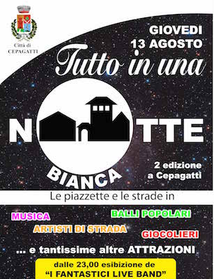 “Tante le novità in programma”– spiega l’assessore alle Manifestazioni ed Eventi, Tiziano Santavenere. “Ci saranno molti artisti di strada che proporranno spettacoli e acrobazie, gruppi locali musicali che si esibiranno in vari angoli del centro, ballerini di flamenco, giochi, giostre e gonfiabili per bambini e alle ore 23, l’evento clou, il concerto dei Fanastici, live band che eseguirà un repertorio di musica italiana dagli anni Settanta al Duemila. Le attività commerciali addobberanno le vetrine e proporranno offerte promozionali per i visitatori. Quest’anno, poi, sarà una festa nella festa perché gli ambulanti, che parteciperanno alle feste patronali in programma dal 15 al 18 agosto, allestiranno le bancarelle qualche giorno prima per prendere parte anche alla Notte Bianca. Non mancherà l’aspetto enogastronomico con stand di street food che proporranno porchetta, pizze fritte, arrosticini, pesce fritto e sangria”.