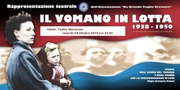 CHIETI – Venerdì 24 ottobre 2014,alle ore 21.00,al Teatro Marrucino di Chieti,andrà in scena lo spettacolo teatrale: “Il Vomano in lotta”- la Storia dell’acqua del Vomano e degli uomini che la trasformarono in luce,un libero adattamento del testo di Virgilio Cipollone.