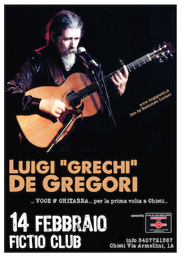 CHIETI – Sabato, 14 Febbraio 2015,presso il Fictio Club,in Via Armellini,1 a Chieti continua la grande musica con l’ospite d’onore Luigi “Grechi” De Gregori . L’altro De Gregori, il fratello maggiore che tanto ha dato alla musica d’autore italiana scrivendo alcuni dei brani che ne hanno segnato la storia, quella stessa storia che ancora oggi contamina la scrittura e la produzione di tante giovani leve. Tra tutte quelle pagine immortali ricordiamo la celebre “Il Bandito e il Campione” premiata con la Targa Tenco nel 1993 come miglior brano dell’anno e poi portata al successo da Francesco De Gregori, il fratello minore.