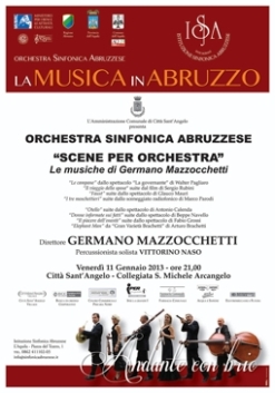 CITTA’ SANT’ANGELO (PE) – L’Orchestra sinfonica abruzzese farà tappa a Città Sant’Angelo con “Scene per Orchestra”: lo spettacolo, che si terrà anche a L’Aquila e Ortona, presenta in una veste nuova brani del Maestro Germano Mazzocchetti, angolano doc, da molti anni compositore per teatro, cinema, radio e televisione. L’appuntamento di Città Sant’Angelo è l’unico a ingresso libero, venerdì 11 gennaio alle 21 nella Collegiata di San Michele Arcangelo: un regalo alla cittadinanza fortemente voluto dal Maestro Mazzocchetti e dall’amministrazione comunale, a chiusura del cartellone natalizio.