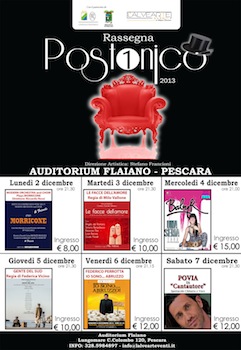 PESCARA – A dicembre a Pescara nasce “Postounico”, la rassegna low cost di qualità dell’Alvearte eventi by Stefano Francioni per chi non vuole rinunciare al piacere delle piéce teatrali, del cabaret e della buona musica.Perché l’arte è per tutti e per godersela non è sempre necessario spendere un patrimonio, anzi a volte con l’arte si può anche aiutare chi ha bisogno.Con il patrocinio del Consiglio regionale d’Abruzzo e della Provincia di Pescara.Dal 2 al 7 dicembre sul palco dell’Auditorium Ennio Flaiano di Pescara si alterneranno un’esibizione musicale, due piéce, lo spettacolo di cabaret di Federico Perrotta, i concerti di Povia e Baby K.
