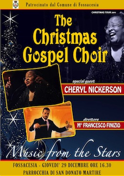 FOSSACESIA (CH) – Govedì 29 dicembre alle ore 16.30, presso la parrocchia di San Donato Martire , a Fossacesia, si esibiranno The Christmas Gospel Choir e la cantante gospel americana di fama internazionale, Cheryl Nickerson.