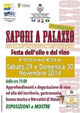 FOSSACESIA – Fossacesia si prepara ad accogliere l’evento autunnale “Sapori a Palazzo” 2014, giunto alla sua undicesima edizione, organizzato dall’Amministrazione Comunale in collaborazione con l’Associazione Culturale Itaca, la Pro Loco Fossacesia Marina e la Consulta delle Associazioni.Sabato 29 e domenica 30 novembre 2014, nell’antico Palazzo Mayer e nel vicolo sottostante si svolgerà la manifestazione in una cornice rinnovata e interattiva.