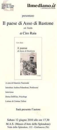 GIULIANOVA (TE) – Sabato 12 giugno, alle ore ore 17.30, verrà presentato presso il Museo d’Arte dello Splendore di Giulianova (Viale dello Splendore, 112) il libro di Ciro Raia “Il paese di Asso di bastone (ed. Guida)”.