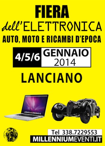 LANCIANO (CH) – Torna, a Lancianofiera, la Fiera dell’elettronica e auto-moto-ricambi d’epoca. L’evento si è consolidato nel corso degli anni come uno degli appuntamenti fieristici più importanti della regione Abruzzo con una media di 7mila presenze per ogni edizione. Per la prima volta la manifestazione si svolgerà, in questa 4a edizione, in tre giornate: sabato 4 a lunedì 6 gennaio 2014. In rassegna, oltre al nutrito Mercato di Elettronica, la III Mostra scambio di auto, moto e ricambi d’Epoca.Come di consueto, l’esposizione si estenderà su 15.000 mq divisi in 3 padiglioni e un piazzale scoperto, per un totale di 250 spazi espositivi.