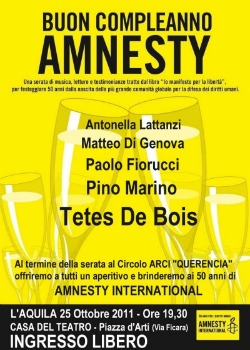 L’AQUILA – Martedì 25 ottobre il gruppo dell’Aquila di Amnesty International festeggerà il 50° compleanno del Movimento con un evento suggestivo: uno spettacolo di musica, letture e testimonianze presso la casa del Teatro – Spazio di Condivisione artistica in Piazza d’Arti alle 19.30.