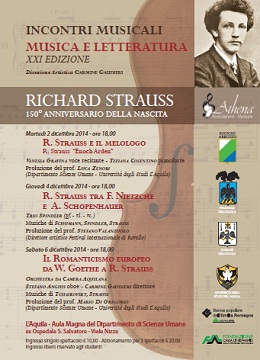 L’AQUILA – L’Associazione Musicale “Athena” ha organizzato anche quest’anno in collaborazione con l’Università degli studi dell’Aquila(Dipartimento di Scienze Umane) la rassegna Incontri Musicali “MUSICA E LETTERATURA” giunta alla XXI edizione.Nonostante le difficoltà economiche che il mondo della cultura sta attraversando (la Provincia dell’Aquila non ancora eroga il contributo ordinario degli anni 2012 e 2013 , a fronte di spese già effettuate dalle Associazioni ,mentre la Regione Abruzzo ha tagliato il 90% di finanziamento sempre alle associazioni culturali),si è voluto fare ogni sforzo per non perdere la continuità di questa iniziativa che negli anni scorsi ha ottenuto entusiastici consensi,suscitando l’interesse del pubblico e ha visto il coinvolgimento di importanti figure rappresentative del mondo musicale a livello solistico ,sia lirico che strumentale e letterario con la presenza di critici musicali molto conosciuti e docenti dell’Università dell’Aquila. L’Edizione che verrà realizzata quest’anno dal 2 al 6 dicembre è incentrata sul rapporto tra Musica e Letteratura del periodo romantico e tardo romantico e dedicata a R.STRAUSS uno dei compositori più famosi del panorama europeo, che ha abbracciato il periodo romantico e oltre. Volendo riassumere lo stile di Strauss notiamo che esso è molto vario e svincolato storicisticamente e quindi privo di un senso di evoluzione nel linguaggio che muta anche in maniera drastica e netta da una composizione all’altra. Abbiamo una prima fase in cui troviamo un legame col romanticismo tedesco e fasi successive che lo collocano nel tardo romanticismo .La rassegna avrà inizio il 2 dicembre (R.STRAUSS e il melologo”) con la presentazione del famoso melologo Enoch Arden scritto su un poemetto di Tennyson molto eseguito soprattutto in Europa che vedrà la partecipazione dell’attrice Vanessa Gravina molto nota al pubblico teatrale e televisivo accompagnata dalla pianista Tiziana Cosentino. Con la prolusione del prof.Zenobi docente di letteratura che proietterà il pubblico nell’ affascinante avventura del marinaio Enoch assimilabile per certi versi alla vicenda di Ulisse nell’Odissea.