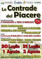Inoltre dal 30 luglio al 2 agosto si svolgerà sempre a Miglianico la manifestazione gastronomica “Le Contrade del Piacere” che l’associazione organizza da anni nel centro del paese con il patrocinio dell’Amministrazione Comunale e la collaborazione dell’A.R.S.S.A . Si potranno riscoprire gli odori e i sapori di un tempo con una passeggiata gastronomica per le varie contrade , dove figuranti in abito abruzzese accoglieranno i visitatori e punti di animazione potranno soddisfare i più svariati desideri. La base di molti piatti, preparati con il massimo della qualità e della tipicità abruzzese, neanche a dirlo è quel gustoso e unico prodotto della nostra terra: il pomodoro a pera d’Abruzzo.