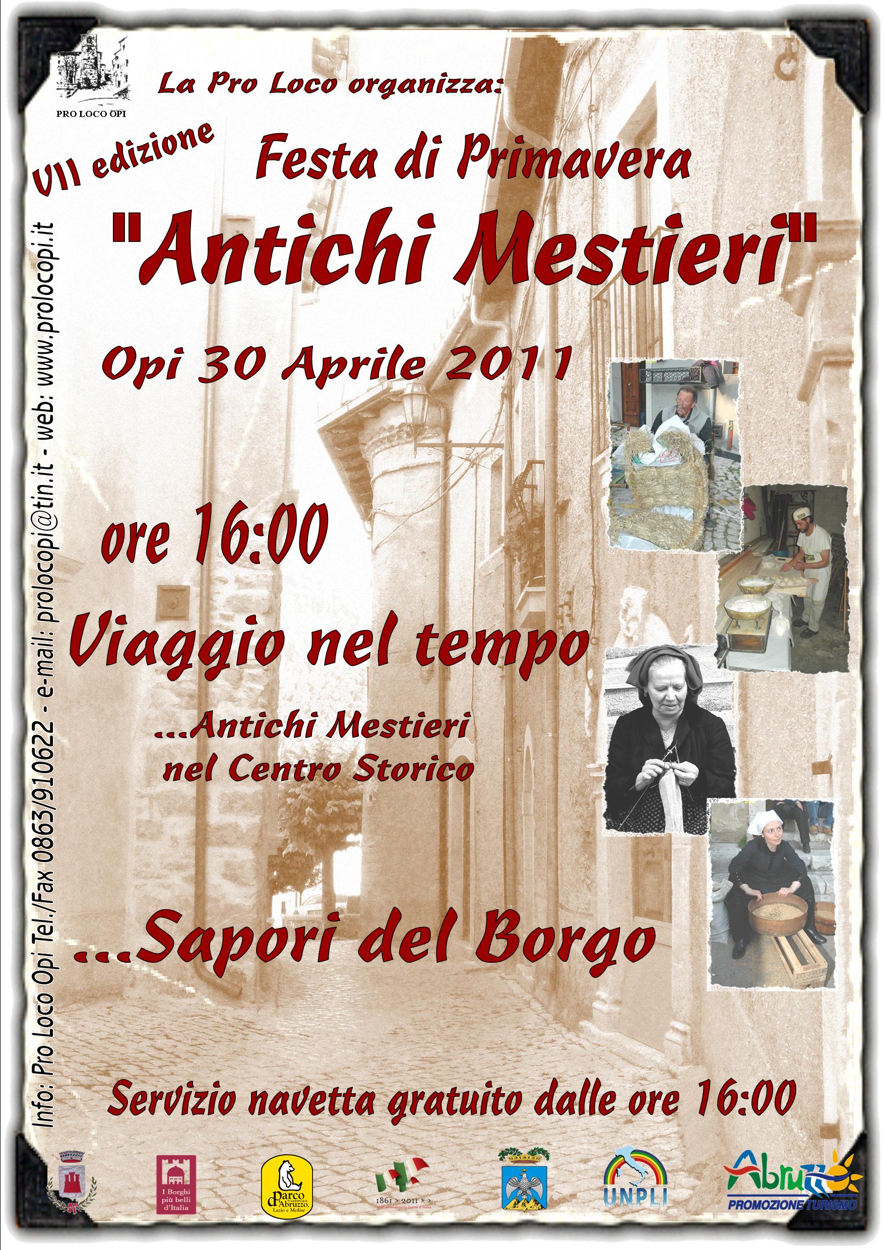 OPI (AQ) – La Pro Loco di Opi organizza per il 30 Aprile 2011 , dalle ore 16.00 la Festa di Primavera “Antichi Mestieri”, una vera e propria celebrazione degli Antichi Mestieri.