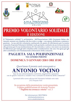 LANCIANO (CH) – Il “Volontario solidale” è un’iniziativa dell’Associazione AMA Frentania Onlus che intende onorare, nel mese di dicembre, un cittadino che ha svolto e svolge – con amore, dedizione, costanza e passione – la sua attività volontaria costituendo un punto di riferimento per la comunità, talvolta non ben compreso e apprezzato dagli altri eppure importantissimo. Il premio “Volontario Solidale “vuole pertanto costituire sia un riconoscimento alla persona, per la sua testimonianza di vita autentica e unica e sia essere un momento di riflessione per tutti gli altri cittadini nella considerazione che una vita spesa per gli altri contribuisce ed è fondamentale al benessere della comunità. Quest’anno il premio sarà consegnato a Antonio Vocino “per la sua entusiasmante curiosità, originalità e passione con le quali è riuscito a rendere viva e attuale la memoria della comunità”.La premiazione si terrà domenica 5 gennaio 2014, alle ore 17.00, presso la Sala Polifunzionale,in via Sandro Pertini a Paglieta. In occasione della premiazione verrà presentata l’ultima pubblicazione di Antonio Vocino “ Paglieta tra cronaca e storia” vol.3