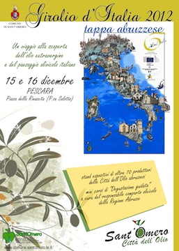 PESCARA – É partito ad ottobre Girolio d’Italia 2012: un itinerario che sta percorrendo le strade dell’olio d’oliva della raccolta e della molitura lungo lo stivale. Dal Sud al Nord diciotto eventi per collegare e coinvolgere tutte le terre dell’olio italiane e mettere in vetrina le peculiarità e il valore dei territori .I vari appuntamenti sono finalizzati dunque a valorizzare il paesaggio, la raccolta e la frangitura delle olive delle culture olivicole italiane che producono l’elemento principe dell’ alimentazione mediterranea. Girolio d’Italia è un progetto di promozione e valorizzazione di una produzione molto importante della nostra agricoltura, ed è stato voluto fortemente dall’Associazione Nazionale Città dell’Olio, che è riuscita ad unire 18 regioni olivetate italiane in un unico progetto-contenitore che funge da vetrina rilevante per la Città dell’Olio che ospita le singole tappe e per l’intera regione di appartenenza in quanto tutti i soci regionali parteciperanno all’evento di riferimento. Girolio d’Italia ha ricevuto il Patrocinio dell’Unione Europea, del Ministero delle Politiche Agricole, del Ministero dell’Ambiente. La prima edizione del 2011 , dedicata all’Unità d’Italia, è stata insignita della Medaglia d’Argento del Presidente della Repubblica per l’alto valore divulgativo.