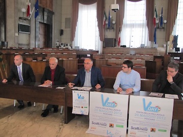 PESCARA – L’assessore allo Sport del Comune di Pescara Nicola Ricotta nel corso di una conferenza stampa convocata in Sala consiliare ha presentato la manifestazione ‘V-Day Festa della Pallavolo’ alla presenza, tra gli altri, del Presidente del Coni Enzo Imbastaro, il Presidente Domenico Di Camillo e Gianni Bisignani. All’iniziativa, domenica prossima, 20 maggio, prenderanno parte almeno 600 giovanissimi atleti. Sarà una giornata da trascorrere insieme ai campioni provinciali della rete, per assistere a partite-spettacolo a suon di schiacciate e alzate. A organizzare l’evento, che per l’intera giornata mobiliterà i due Palazzetti dello sport di via Elettra e il campo ‘Adriano Flacco’ per ospitare incontri ed eventi, è stata la Federazione Italiana Pallavolo con l’amministrazione comunale di Pescara , che ha patrocinato l’intera manifestazione concedendo anche l’uso gratuito dei propri spazi per garantire quell’azione di promozione dello sport implicita nel titolo di ‘Città Europea 2012’.