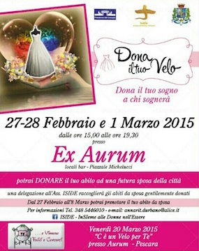 “Ho accolto con grande entusiasmo l’iniziativa dell’Associazione Iside che promuove l’evento “Dona il tuo velo”, finalizzato alla raccolta di abiti da sposa da donare alle giovani. La manifestazione si terrà dal 27 febbraio al 1 marzo, dalle ore 15.00 alle ore 19,30, presso i locali del Bar – Piazzale Michelucci – all’Aurum. Lì una delegazione dell’Associazione sarà impegnata per la raccolta di abiti da sposa che le signore di Pescara e delle città vicine vorranno donare per le spose meno fortunate.
