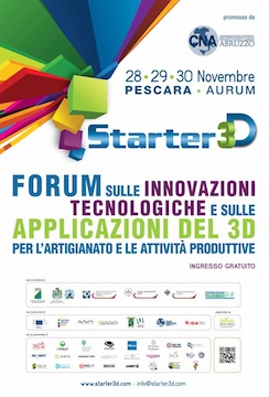 PESCARA – Si svolgerà dal 28 al 30 Novembre 2013 a Pescara “Starter 3D”, il primo grande evento dedicato alle tecnologie del 3D, ovvero alle applicazioni informatiche che consentono di produrre immagini statiche o in movimento attraverso l’elaborazione di modelli tridimensionali, ormai largamente in uso nelle progettazioni dell’artigianato e delle attività produttive in genere. Sarà la suggestiva cornice dell’Aurum e di Europaurum ad ospitare un evento destinato a trasformare la città adriatica in una vera e propria capitale dell’innovazione, una full immersion in laboratori, esposizioni, documentari, workshop e spettacoli realizzati da aziende produttrici di macchine 3D tra le più importanti a livello nazionale e internazionale. Accanto agli espositori esperti e specialisti di fama internazionale illustreranno il funzionamento delle tecnologie, le loro svariate applicazioni, lo stato dell’arte e le prospettive per il prossimo futuro.