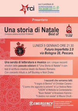 PESCARA – Lunedì prossimo, 5 gennaio dalle ore 21, nel circolo Futuro Imperfetto 2.0 (in via Bologna 26/28 a Pescara) torneranno i racconti di Natale del contest di scrittura creativa ideato dallo scrittore Alessio Romano. L’evento è organizzato dall’ARCI di Pescara con il contributo della fondazione Pescarabruzzo. Una serata di letteratura, musica e solidarietà dove saranno letti i cinque racconti vincitori delle passate edizioni: “Il sogno di Benino” di Christian Carano, “L’uomo che aggiusta la polvere” di La Vedova Nera, “USDN” di Mafalda la Contestataria, “Buon Natale” di Anastasio Karonis e “Il destino non esiste” di Maura Chiulli fresca vincitrice dell’ultima edizione. Tra un racconto e l’altro il musicista Christian Carano eseguirà brani tributo a Jeff Buckley e Nick Drake. Durante la serata i volontari del Gruppo Emergency di Pescara saranno presenti con un banchetto info/gadget.