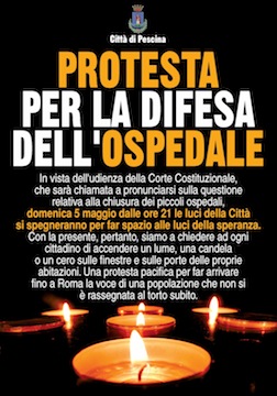Oggi,5 maggio 2013, a partire dalle ore 21,00, le luci della Città verranno spente, per far spazio alle luci della speranza. Sarà una contestazione pacifica e diversa dalle altre volte; la comunità pescinese non sarà chiamata a scendere nelle strade ,ma manifesterà la propria posizione di difesa del diritto alla salute accendendo un lume, una candela o un cero sulla porta e sulle finestre delle abitazioni.