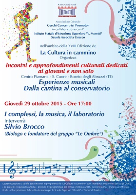ROSETO DEGLI ABRUZZI (TE) – Oggi, giovedì 29 ottobre 2015 alle ore 17:00 si terrà il secondo incontro della XVIII edizione de “La Cultura in cammino”. La manifestazione è organizzata dall’associazione culturale Cerchi Concentrici Promotor ed è un momento di confronto e di dibattito su temi legati all’attualità e alle problematiche giovanili, grazie alla presenza di tanti studenti delle Scuole Superiori e universitari. L’evento si svolgerà presso la sala conferenza del “Centro Piamarta” del S. Cuore di Roseto e verterà sul tema: “Esperienze musicali. Dalla cantina al conservatorio”, coinvolgendo personaggi locali che hanno da sempre avuto la passione per le sette note e che poi nella vita o hanno continuato su questa strada a livello professionale oppure si sono dedicati ad altro, non perdendo mai questa forte passione. Il secondo appuntamento, quello per l’appunto del 29 ottobre, vedrà impegnato