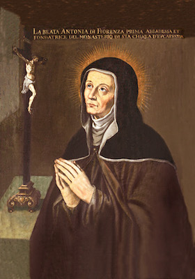 Antonia nacque a Firenze intorno al 1400. Andata sposa giovanissima ad un suo coetaneo, prematuramente morto a qualche anno dal matrimonio, ebbe un figlio che curò da sola e da sola attese alla sua prima educazione. Non intese passare a seconde nozze, nonostante le raccomandazioni dei familiari, per l’inatteso arrivo della chiamata alla vocazione. In quegli anni Bernardino da Siena, insieme ad altri frati minori, stava diffondendo l’Osservanza, che avrebbe dato un nuovo impulso all’ordine francescano con il richiamo all’austerità della Regola di Francesco ed alla povertà. Bernardino, predicando nelle chiese e sulle piazze di tutta Italia, aveva suscitato un’autentica primavera di vita cristiana. Predicò anche nella Chiesa di S. Croce, a Firenze, dall’8 marzo al 3 maggio 1425. Antonia lo ascoltò, maturando nel cuore la decisione di consacrarsi a Dio.
