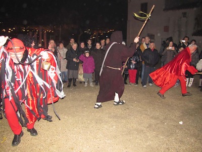 La serata si è aperta con il saluto del parroco della chiesa Santo Stefano Don Vito Cantò, e con la celebrazione della Santa Messa, con Padre Egidio,del Convento dei Frati Minori Cappuccini della Madonna dei Sette Dolori,e la Polizia municipale di Spoltore, con il comandante Panfilo D’Orazio, che, portando il Gonfalone del Corpo, ha celebrato anche la ricorrenza del San Sebastiano,santo patrono della Polizia urbana. A conclusione del momento religioso, il vicesindaco Rosini ha omaggiato il Corpo con una Targa ‘quale ringraziamento per l’impegno profuso ogni giorno a tutela dei cittadini’. Terminata la messa è stato acceso il gran falò situato al centro dell’aia, mentre è iniziata la sacra rappresentazione de ‘Lu Sant’Andonie’ animata dalle Associazioni ‘Cultura e Tradizioni Teatine’ di Francesco Stoppa e ‘I Colori del Territorio’ di Edgardo Cotellucci. Sant’Antonio è arrivato lungo un percorso illuminato dalle torce e, al centro dell’Aia, è partita l’eterna lotta tra il bene e il male, tra il santo, affiancato da un angelo, e il Diavolo e le sue tentazioni, con la vittoria finale di Sant’Antonio che ha schiacciato la testa del Diavolo.