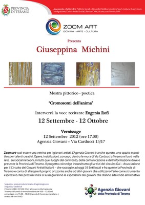 TERAMO – E’ la pittrice e poetessa Giuseppina Michini, con la personale “Cromosomi dell’anima”, la protagonista del prossimo appuntamento di Zoom Art, in programma mercoledì 12 settembre, alle ore 17, presso l’Agenzia Giovani di via Carducci.L’iniziativa è stata promossa dall’Assessorato alle Politiche Giovanili della Provincia di Teramo in collaborazione con l’Agenzia Giovani per sostenere e promuovere la giovane creatività teramana.