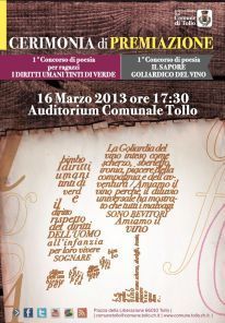 TOLLO (CH) – Domani, 16 marzo 2013, presso l’Auditorium di Tollo si terrà la cerimonia di premiazione della prima edizione del Concorso di poesia: “Il sapore goliardico del vino”.