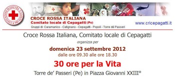 TORRE DE’ PASSERI (PE) – Domenica 23 settembre 2012 dalle ore 09.30 alle ore 18.30, la Croce Rossa Italiana organizza 30 ore per la Vita a Torre de’ Passeri, in Piazza Giovanni XXIII°. L’iniziativa è promossa dal Comitato Locale di Cepagatti a cui fanno capo oltre 200 volontari che svolgono la propria attività nelle sedi di Cepagatti, Catignano, Caramanico Terme, Popoli e Torre de Passeri. L’obiettivo è quello di diffondere nella popolazione la conoscenza delle pratiche di rianimazione cardiopolmonare in situazioni di emergenza e di aumentare la disponibilità delle attrezzature mediche salvavita nelle scuole statali e nelle strutture sportive pubbliche. I fondi raccolti contribuiranno all’acquisto di presidi salvavita, in particolare, di defibrillatori semiautomatici esterni (DAE) utilizzabili da personale non medico e da destinare a strutture sportive pubbliche e a scuole statali.