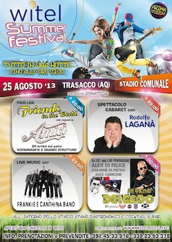 TRASACCO (AQ) – Domani,25 agosto 2013, a Trasacco presso lo stadio comunale dalle ore 20 in poi si terrà l’evento “WiTel Summer Festival”. Divulgare la cultura e la musica tra i giovani al fine di creare alternative valide in un contesto locale non sempre reattivo con la dinamicità dei tempi che evolvono. “Questo è l’obiettivo da raggiungere – dichiara il sindaco di Trasacco Mario Quaglieri – attraverso il “WiTel Summer Festival” , progetto organizzato dall’associazione culturale Fantasylandia che consiste nel portare nel nostro paese e nella Marsica personaggi dello spettacolo conosciuti in tutta la nazione per le loro qualità artistiche”.