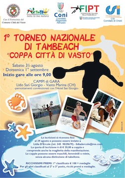 VASTO (CH) – Il Tambeach, ovvero il tamburello in spiaggia, approda sul litorale vastese. Si terrà, infatti, nel week-end a cavallo tra il 31 agosto e il 1.mo settembre il primo Torneo nazionale di questo sport che sta spopolando sulle spiagge del centro-nord Italia. Nella Sala del Gonfalone di Palazzo di Città, la presentazione ufficiale dell’evento organizzato dall’Associazione APAV con il supporto del Coni e della Federazione Italiana Palla Tamburello (FIPT) e il patrocinio del Comune di Vasto, del CSI-Comitato di Chieti e della Regione Abruzzo.