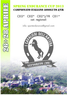 VITTORITO (AQ) – Dal 26 al 28 aprile a Vittorito avrà luogo l’edizione 2013 della Spring Endurance Cup. In programma tre categorie internazionali, il Campionato Italiano Assoluto Juniores e Young Riders e una tappa del Campionato ASSI. Il grande week-end abruzzese organizzato dalla ASD I Cavalieri dell’Antera di Vittorito (Aq), presenta una delle gare più importanti della stagione endurance e uno dei percorsi più belli d’Italia.