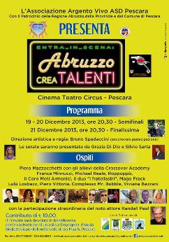 PESCARA – I giorni 19, 20 e 21 dicembre presso il Teatro Circus di Pescara, l’Associazione Argento Vivo ASD ha organizzato l’evento dal titolo “Abruzzo Crea Talenti”. Il ricavato sarà devoluto in beneficenza per la costruzione dell’asilo in Etiopia a Doyogena e per le famiglie bisognose sul nostro territorio. L’evento è patrocinato dalla Regione Abruzzo, dalla Provincia e dal Comune di Pescara.
